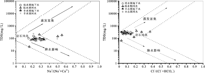 冬季枯水期地下水样点偏离河水及降水,河水TDS虽与地下水TDS较为接近,但两者的δ18O值差异显著。枯水期流动缓慢的地表河水δD和δ18O较富集, 而此时的地下水δD和δ18O较低,说明枯水期河水并未对地下水的有所扰动。丰水期,地下水样点与河水样点分布较为集中,地表水与地下水的水化学及稳定同位素空间差异较小,几个河水的样点与地下水样点高度重合,说明这一时期地下水可能受到地表河水明显的扰动,两者之间存在一定水力联系[25,26]。丰水期大气降水δ18O值与地下水及河水的δ18O值较为接近,但其TDS值低于地下水及河水,结合Gibbs图分析结果(图7),这一时期地下水也受到TDS值较低的降水的扰动。
