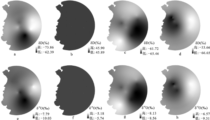 图5 研究区不同时期地下水、河水δD和δ18O时空变化 a~d分别为枯水期地下水、河水、丰水期地下水、河水δD;e~h分别为枯水期地下水、河水、丰水期地下水、河水δ18O。