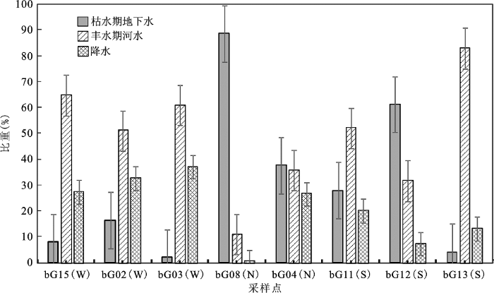 图8 海河源区丰水期典型采样点地表水与地下水补给比例