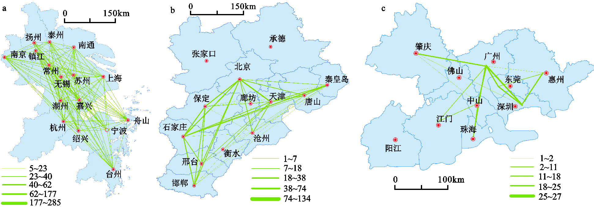 | Fig. 3 High speed train network in the Yangtze River Delta (a), Beijing-Tianjin-Hebei (b) and the Pearl River Delta (c) |
