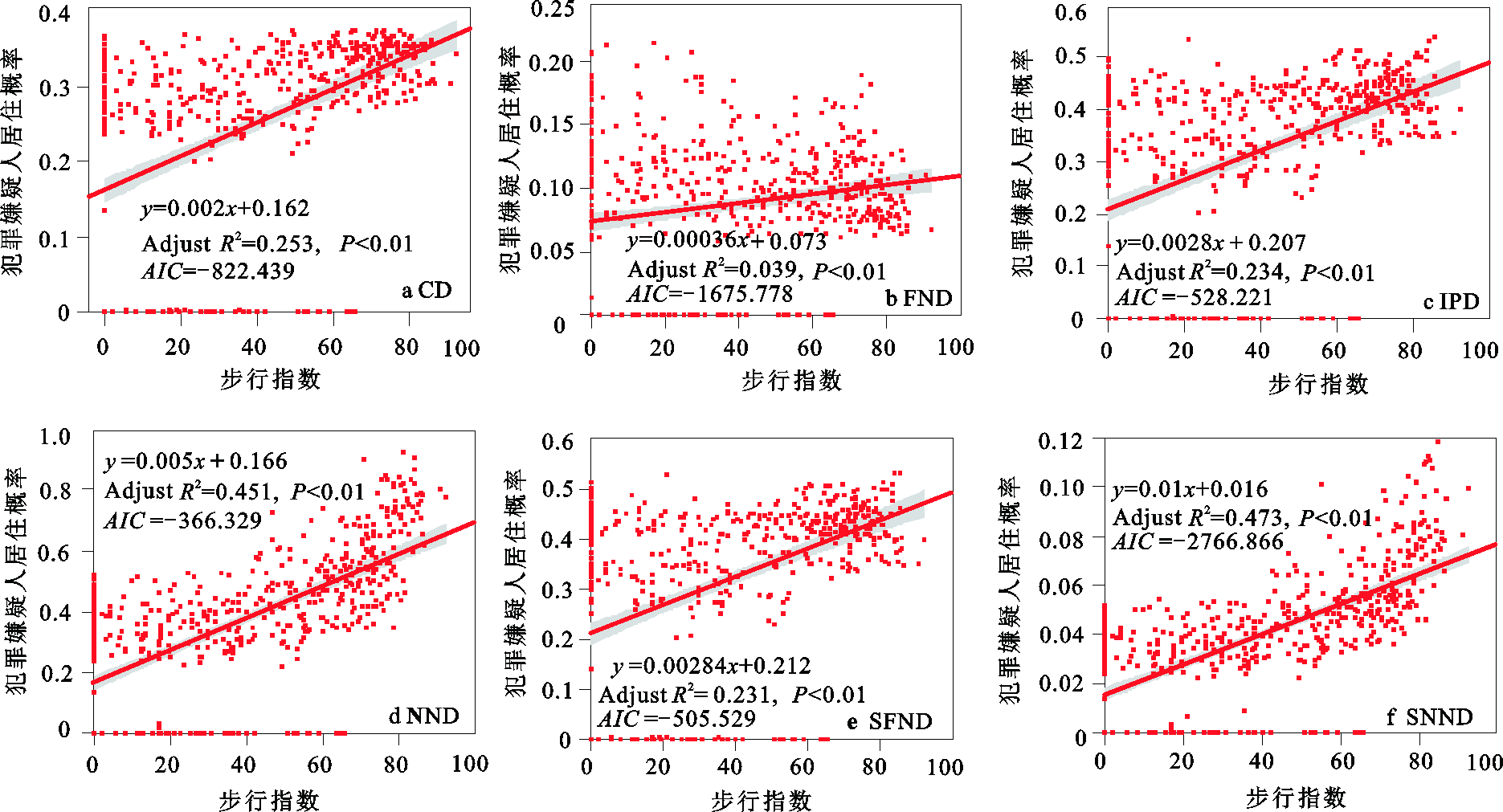 5) 广义线性模型。广义线性模型(Generalized Linear Model,下文简称为GLM)最早是由Nelder和Wedderburn在1972年提出的常见正态线性模型的直接推广[21 ] ,可以适用于连续数据和离散数据。本研究使用广义线性模型分析两抢一盗警情案发次数、犯罪嫌疑人居住概率与步行指数的关系。