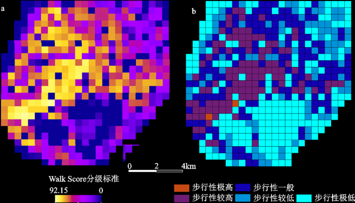 图2 城市步行环境 a. 步行指数空间分布; b.可步行性