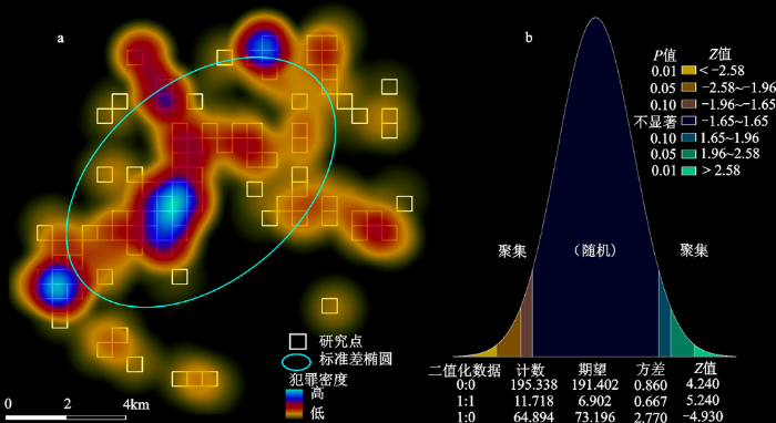 进行空间统计分析前,基于Join Count算法计算两抢一盗警情案件点的空间自相关性并进行空间聚合。Join Count算法和空间聚合的结果显示(图3 )。二值化数据0∶0和1∶1的计数均大于期望,类型1∶0计数小于期望,说明两抢一盗警情案件点呈空间聚集模式,不存在离散化趋势,且 Z 值显示通过显著性检验,有较强的空间正相关性。可进行下一步空间统计分析。