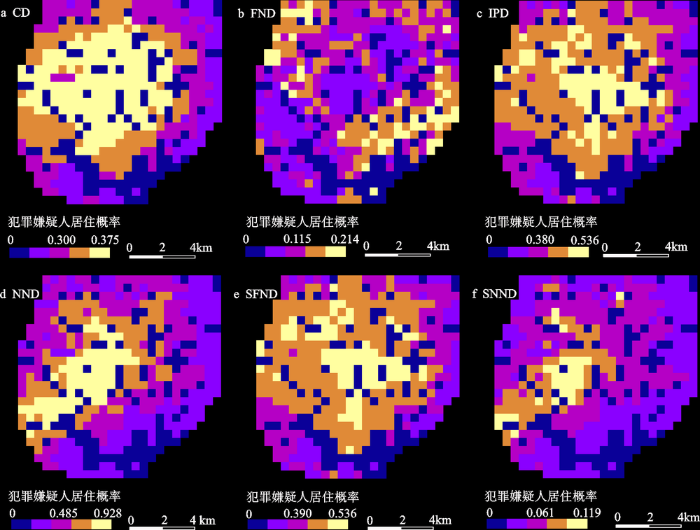 ... 在CGT模型中,“心理缓冲区”距离 B 是最为重要的参数,该参数反映了犯罪嫌疑人犯罪出行行为模式以及逃窜模式,对于模型的预测精度影响较大.根据戴侃等的研究,犯罪案件点的空间分布一定程度上反映犯罪人的出行情况,在无更具体的犯罪嫌疑人信息的情况下,通过空间点群距离优化算法来推断 B 值是可行的[24 ,25 ] .空间点群距离优化算法的核心是通过犯罪案件点的空间分布计算不同意义的距离来替代 B 值,本文研究使用的距离包括平均最邻近距离一半(SNND,394 m)、平均最邻近距离(NND,788 m)、平均最远距离一半(SFND,10 276 m)、平均最远距离(FND,7 864 m)、点间平均距离(IPD,7 772 m)以及质心距离(CD, 5 303 m).不同的距离代表着犯罪嫌疑人不同的心理缓冲区,SNND和NND所代表的这类犯罪嫌疑人通常在离家或落脚点394 m和788 m左右进行犯罪,这类犯罪嫌疑人的心理缓冲区在1 km以内,极有可能属于惯犯,而FND、IPD、CD和SFND所代表的犯罪嫌疑人通常在离家或落脚点5 ~10 km左右进行犯罪.这类犯罪嫌疑人的心理缓冲区较大,可能代表着这类犯罪嫌疑人属于初次犯罪或者是流窜作案.而CGT模型结果是一个连续的概率网格表面,概率值越大,说明这个区域是犯罪嫌疑人居住地或落脚地的概率越大.同时也说明在这些概率高的区域实施搜捕成功可能性就越大.CGT模型结果如图4 (自然间断点法)所示,可看到IPD和SFND的结果较为一致,居住概率最大值达到0.536,说明这类犯罪嫌疑人在那个格网居住的可能性达到53.6%,可以是重点搜捕区域.而NND和SNND结果分布趋势有一定相似程度,但是概率值差别较大,NND居住概率最大值能达到0.928,而SNND的概率不超过0.119,CD的结果呈现出一个同心圆的结构,以中心向外辐射,概率值的最大值在0.375左右,FND的结果中概率较高的区域则是零星分布,总体上来说,高值区域普遍为研究区的火车站、老城区以及机场沿线区域. ...