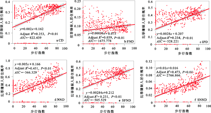 国外研究者开始尝试研究步行环境对城市犯罪影响[7 ] ,目前不少研究将邻里环境安全性、步行性与健康结合分析[7 ,8 ] ;Loukaitou-Sideris评估邻里环境安全性对体育活动(骑车或者步行)的影响[9 ] 。以上研究大多通过步行可达时间表征可步行性,Gilderbloom等人使用Walk Score表征步行环境,在美国170个邻里单元研究中发现Walk Score对邻里住房估价、犯罪和丧失抵押品赎回权产生积极影响[10 ] 。尽管国内目前暂无步行环境对城市犯罪影响的研究,但曾敏玲和郑文升等已通过空间句法表征街道人流量与空间可达性,研究其与两抢一盗警情的关系[11 ,12 ] 。总之,目前单纯研究步行环境对于城市犯罪的影响较少,国外大多数研究也都包含如健康等其他因素在内,中国语境下的实证研究也处于空白。