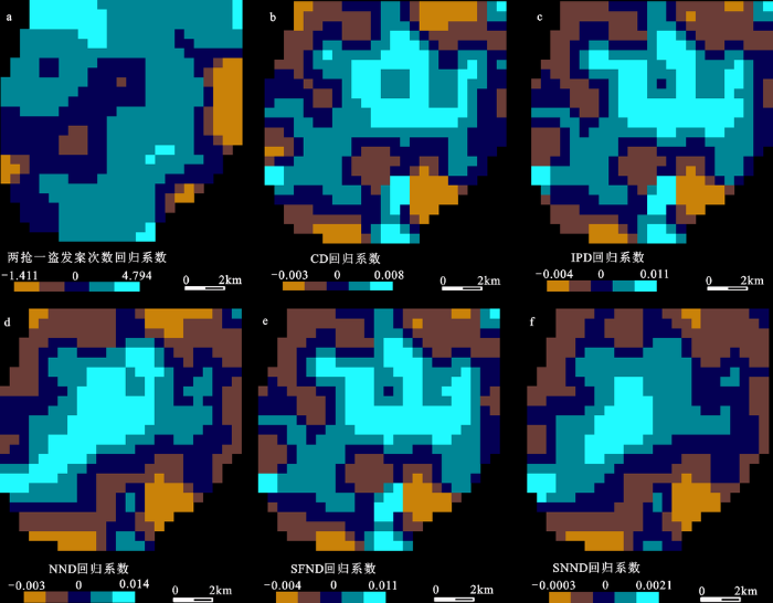 从空间分布图发现,步行指数较高的区域、两抢一盗案发次数较高与犯罪嫌疑人居住地概率较高的区域有较高的重叠性。为进一步探究三者的相互作用,本文选用Pearson相关系数、GLM与GWGLM进行分析(图5 、6,表1 )。Walk Score与两抢一盗案发次数、CGT模型多距离画像结果的相关性均呈正相关关系,均通过显著性检验。Walk Score与NND,SNND的相关系数最高,分别达到0.67和0.69,与CD、IPD、SFND的相关系数分别为0.50、0.48和0.48,与两抢一盗案发次数,FND的相关系数为0.22和0.20。两抢一盗案发次数的概率分布符合泊松分布,居住人概率与步行指数有一定线性关系,故GLM的指数分布族分别选择泊松分布与正态分布。泊松回归模型结果显示,Walk Score的回归系数为0.761,截距- 1.387,且通过了显著性检验,说明Walk Score每增加1个单位,两抢一盗案发次数均值会增加2.14次左右。结果表明Walk Score对两抢一盗警情可能是正相关的作用,步行环境越好,两抢一盗警情发生可能性越大。简单线性回归模型结果显示:CD、IPD、NND、SFND和SNND结果与Walk Score的线性关系较为显著(回归方程 R 2 较高,散点图线性趋势显著),从这几个拟合模型来看,Walk Score每增加1个单位,犯罪嫌疑人居住地概率分别增加0.1%到0.5%不等。而FND结果与Walk Score线性关系较弱。结果表明Walk Score对犯罪嫌疑人居住地概率可能也存在正相关作用,城市步行环境越好,犯罪嫌疑人居住概率越高。传统的广义线性模型未考虑到空间异质性的问题,使用全局回归模型无法处理这个问题,本文选用考虑空间异质性的GWLGM进行对比分析。