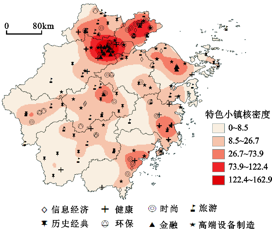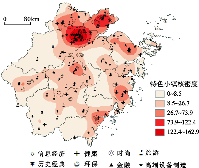 城镇空间研究一直是地理研究的热点问题,也是产业经济与区域经济研究的重要问题。国内外学者对城镇的空间结构特征、空间演化规律、城镇空间功能与社会发展的相互影响[2 ,3 ,4 ,5 ,6 ,7 ,8 ,9 ,10 ] 等方面进行了广泛的研究。对于特色小镇这一具有独特内涵和特征的创新综合发展平台,当前的研究主要集中在特色小镇的发展理念、规划设计、治理机制以及创建培育实践[11 ,12 ,13 ,14 ,15 ] 等领域。尽管近年来部分学者开始关注特色小镇的产业空间组织特性,并从产业空间布局演变的视角进行了一定的定性分析[16 ,17 ] ,但总体而言,较少运用空间分析方法来探究特色小镇的空间分布规律,缺乏对中宏观层面特色小镇内部空间结构的探索,使特色小镇的空间秩序优化和空间效率提升缺乏必要的研究基础。