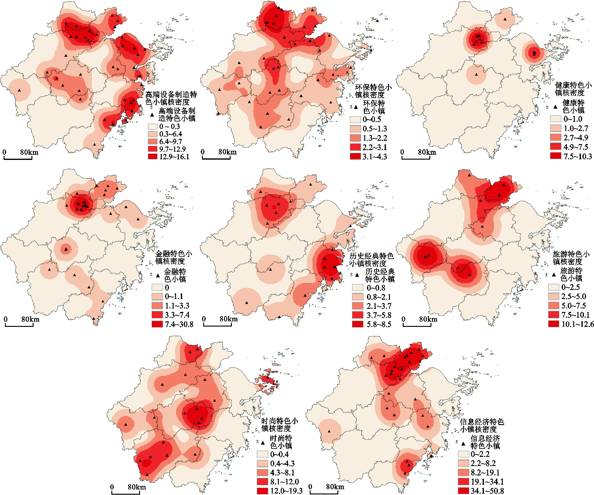 由图2 可知,特色小镇空间分布密度差异显著,高端设备制造和旅游类特色小镇数量多且布局分散,这与浙江省相对发达的制造业和丰富的人文自然景观资源有较高关联;金融和信息经济类较高集中分布在局部地区,主要聚集于金融产业和信息产业发达的杭州、宁波等省会或副省级城市;健康、环保、时尚和历史经典类特色小镇的分布密度介于前述产业类型的特色小镇之间,与各地已有的产业基础存在较大的关联,如以历史经典类特色小镇为例,杭州西湖茶叶、湖州丝绸、绍兴黄酒、龙泉青瓷等都具有千年历史传承,且不断进行产业技术更新,将历史经典与现代市场进行有机融合,以此为基础形成了风格各异的特色小镇。