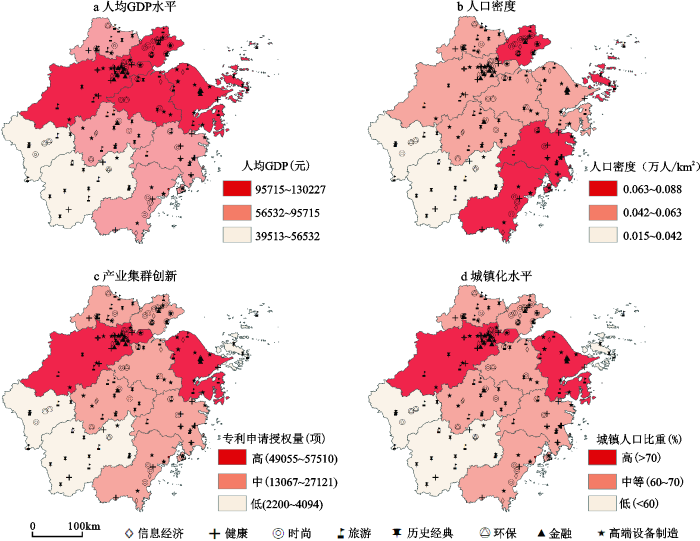 3) 产业集群创新。具有产业集群特征的“块状经济”是浙江区域经济发展的重要组织形态。产业集群有利于实现要素的空间集聚,劳动力的转移和人口集聚,为城镇地域空间的扩展和城镇化水平的提高提供产业支撑[27 ] 。根据陆国庆等学者的研究[28 ,29 ] ,以浙江省2013~2015年各市专利授权量均值作为判别产业集群创新程度的指标,将浙江省划分为产业集群创新程度高、中和低3类地区(图3 c)。结果显示,信息经济、金融和高端制造类特色小镇主要分布在产业创新程度高的区域;健康和时尚类特色小镇分布在产业创新程度高和中等的地区;旅游类特色小镇均匀分布在各区域;环保和历史经典类特色小镇则主要分布在产业集群创新程度较弱的地区。总体而言,特色小镇作为产城融合和产业转型升级的新载体,需通过产业集群创新实现要素高阶化和产业集群价值链攀升。但值得关注的是,产业集聚创新对特色小镇建设的推动作用存在一定程度的差异。这与特色小镇的主要产业特色存在着密切关联。例如信息经济和高端制造等前沿、新兴产业注重创新资源、信息和成果等互通共享,形成紧密精细的产业创新网络,而历史经典类产业需要创新为其注入新活力的同时,更强调在历史人文内涵的挖掘和传承。