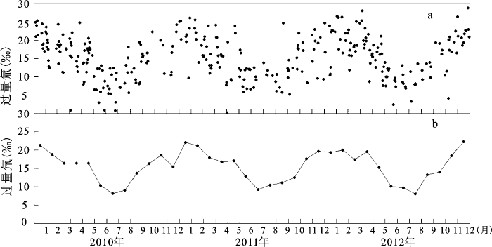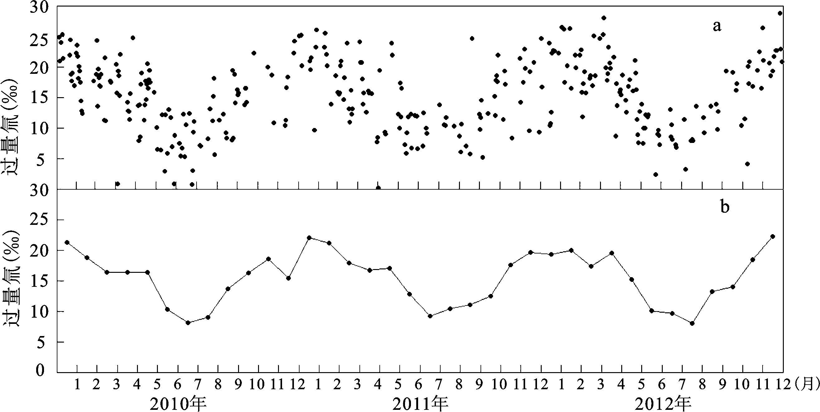 1) 地处亚热带季风区的洞庭湖流域,降水中过量氘季节变化明显,这主要因不同季节的降水具有不同的水汽源,如春季降水主要源自西太平洋d 含量高的水汽凝结,夏季降水则主要源自印度洋d 含量低的水汽凝结。另外,夏季降水中过量氘高于全球平均则与陆地蒸发水汽补充有关。