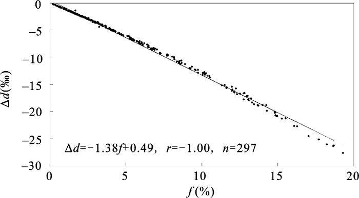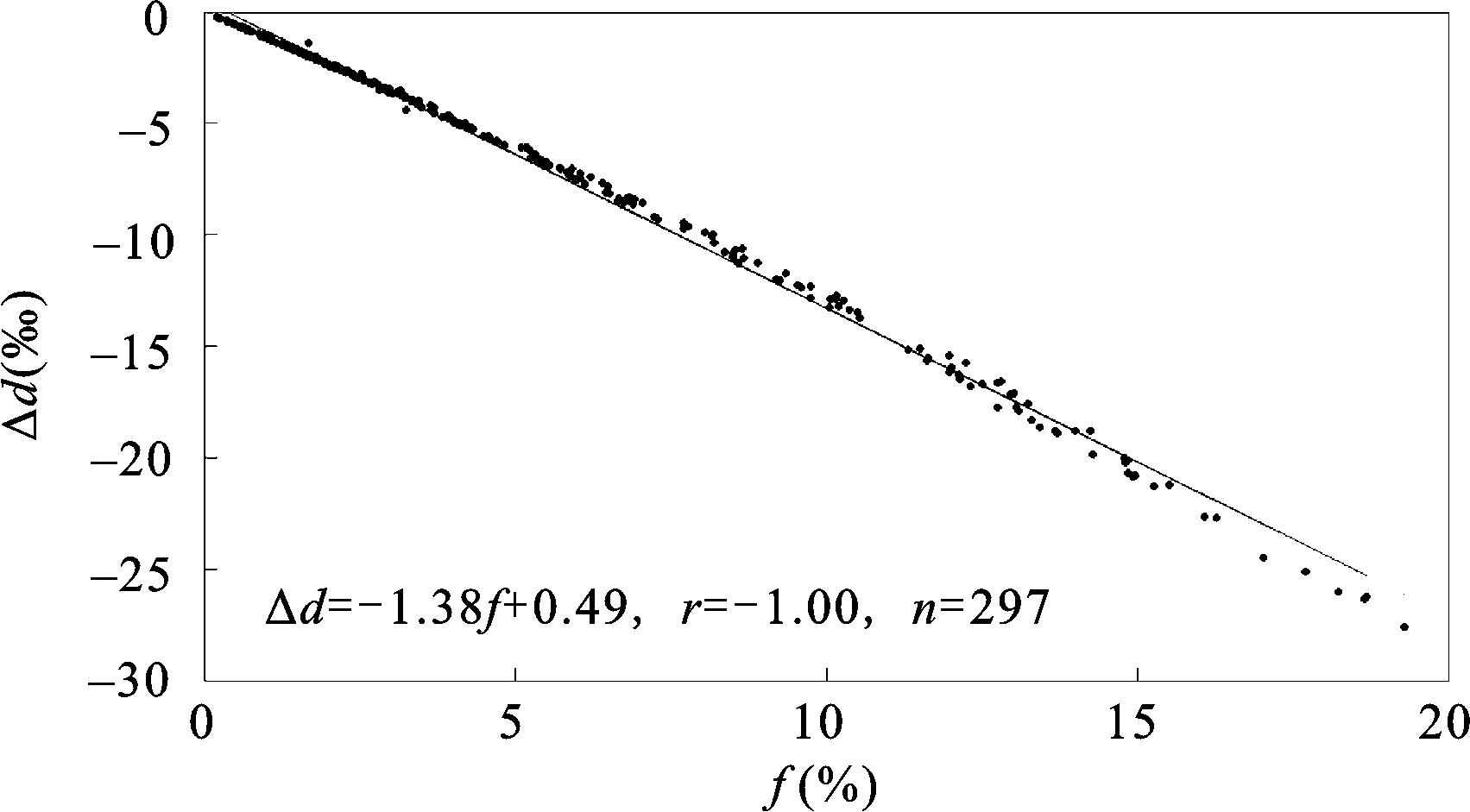 式中, 2 α 、 18 α 分别对应液- 气相时,氢和氧同位素的平衡分馏系数。这里,我们计算了长沙全年及春夏秋冬大气水线的观测斜率(S )与理论斜率(ST ),结果见表1 。从表中可以发现,4个季节大气水线的理论斜率均大于观测斜率,这主要由下落雨滴蒸发引起降水中d 减小,结果使得大气水线的斜率减小[10 ,29 ,30 ] 。研究认为大气水线的理论斜率与观测斜率差值大小与下落雨滴蒸发强度成正比[31 ] ,由此判断长沙下落雨滴蒸发强度:冬>春>秋>夏。我们注意到全年大气水线的理论斜率略低于观测斜率,这种情形在中国南方的常熟、桃源、环江也存在[31 ] 。另外,长沙全年大气水线的理论斜率与洞庭湖流域的桃源(8.55)和会同(8.55)非常接近[31 ] ,这也反应它们具有相似的水汽来源。