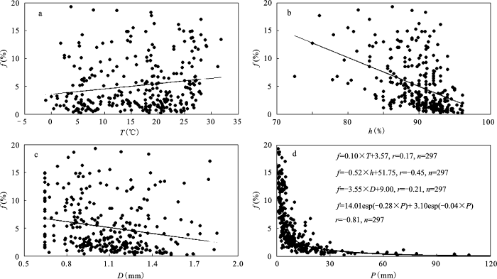 研究表明气温、湿度以及雨滴大小是影响下落雨滴蒸发的主要因子[11 ,13 ,24 ] 。为了揭示研究区上述因子对下落雨滴蒸发的影响,这里计算了上述因子与下落雨滴蒸发比关系。同时,还给出了降水量与下落雨滴蒸发比的关系,结果见图3 。可以看到,下落雨滴蒸发比与气温呈显著正相关,与相对湿度则呈显著负相关(均超过0.01的信度水平),即气温越高,湿度越小,下落雨滴蒸发越强烈,反之气温越低,湿度越大,下落雨滴蒸发越弱。就雨滴直径来看,下落雨滴蒸发随雨滴直径增大而减弱,其原因在于,雨滴直径越大,雨滴表面曲率越小,水分子越不易逃离雨滴,即越不易蒸发。下落雨滴蒸发随降水量的变化表现出指数函数变化,大致以降水量10 mm为界,降水量大于10 mm时,雨滴蒸发随降水量增大变化非常小;降水量小于10 mm时,雨滴蒸发随降水量减小而增加非常快。降水量与下落雨滴蒸发之间的这种关系并非指示降水量直接影响雨滴的蒸发,而是湿度、雨滴直径等综合作用的结果,如降水量越大,往往对应湿度、雨滴直径越大。