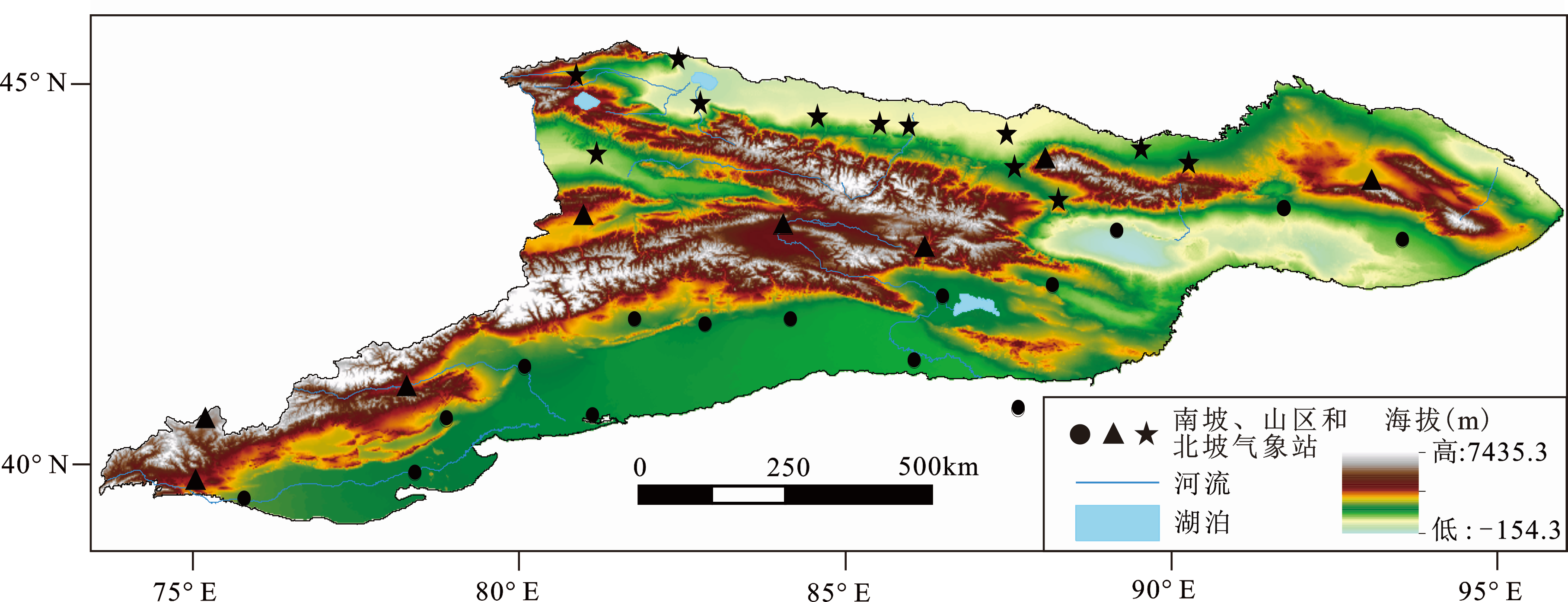 天山是世界七大山系之一,也是世界上距离海洋最远的山系和全球干旱地区最大的山系;中国境内的天山山脉(73.79~95.97°E,39.47~45.38°N )位于天山山系的东部 (即为本文所指天山)(图1 ) ,呈东西走向横亘于新疆维吾尔自治区中部,西起中国与吉尔吉斯斯坦边界,东至哈密市以东星星峡戈壁,全长约为1 700 km,占整个天山山系总长度的2/3以上;南临中国最大的沙漠塔克拉玛干沙漠,北部是古尔班通古特沙漠,南部宽度为250~350 km[23 ] ;中国境内的天山面积约为57×104 km2 ,占新疆面积的34.5%[25 ] ;天山山脊平均海拔高度为4 000 m,最高峰托木尔峰,海拔达7 443.8 m。天山是中国新疆最重要的水资源发源地之一,拥有冰川9 035条,冰川面积达9 225 km2 ,冰储量1 011 km3 ,是中国山岳冰川分布最多的山脉之一[26 ] ,被誉为中国新疆地区重要的“水塔”,天山北坡的博尔塔拉河、精河和伊犁河,以及南坡的阿克苏河、开都河等均发育于天山;同时,天山地区还分布着面积广阔的天然草场,如巴音布鲁克草原,面积达23 835 km2 是中国面积第二大的草原。因此,天山山区的气候变化对区域水循环过程和新疆农牧业的发展具有重要的影响,研究天山山区及其南北坡的极端气候变化具有重要的科学意义。