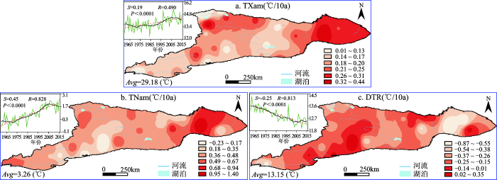 图2 1960~2015年平均最高(a)、最低气温(b)和气温日较差(c)的时空变化S 表示该指数年际倾斜率(下图同);Avg 表示1960~2015年区域平均值(下图同);小图纵坐标分别为a.TXam(℃);b.TNam(℃);c.DTR(℃)