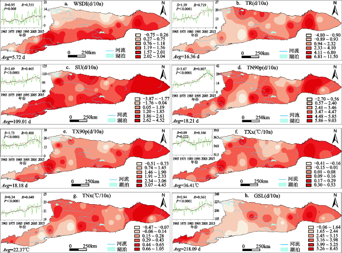 图3 极端气温暖指数的时空变化 小图纵坐标名称(单位)分别为:a, WSDI (d); b, TR (d); c, SU (d); d, TN90p (d); e, TX90p (d); f, TXx (℃); g, TNx (℃); h, GSL (d)