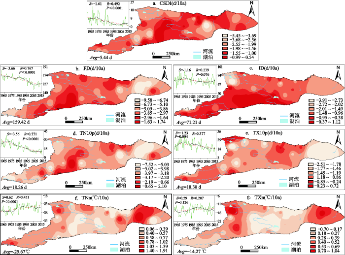 图4 极端气温冷指数时空变化 小图纵坐标分别为:a, CSDI (d); b, FD (d); c, ID (d); d, TN10p (d), e, TX10p (d); f, TNn (℃); g, TXn (℃)