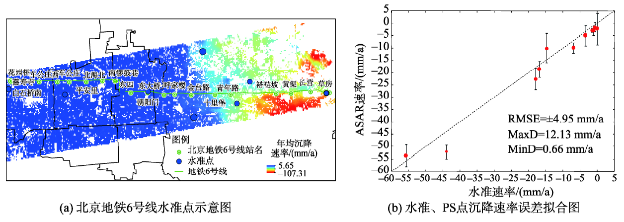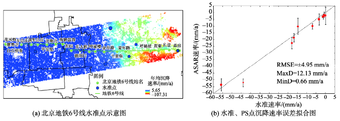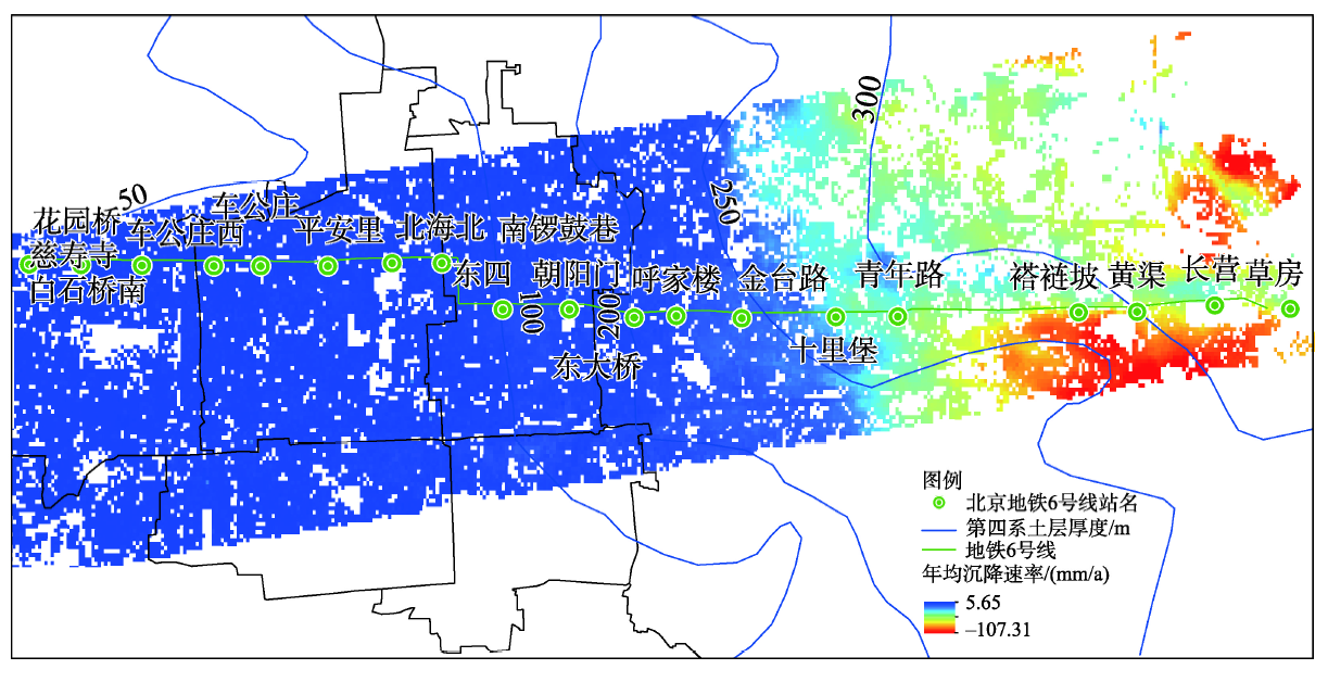 基于上述PS-InSAR技术,获取了北京地铁6号线及周边区域的时间序列干涉测量结果(如图1所示,以2010年4月13日第一景影像为参考基准,正值表示抬升,负值表示沉降)。