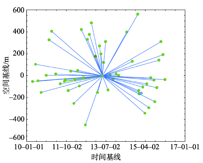 使用2010年4月至2016年2月6日间53景 TerraSAR影像进行永久散射体干涉处理,选取2013年5月9日的影像作为主影像,构成52对时序差分干涉对,干涉对的空间、时间基线如图2所示。根据精密轨道参考数据,将剩余52景影像分别和主影像进行配准(配准精度小于0.2个像元)。