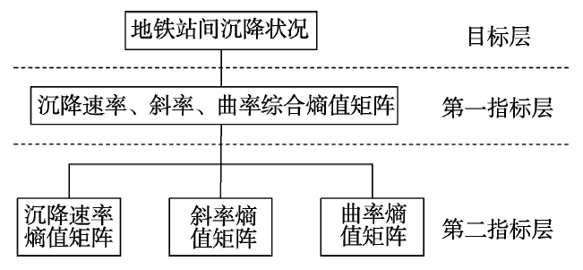 对于地铁这类呈线状分布的设施,影响评定其沉降严重程度的因素较多,将单一的熵理论与层次分析方法结合,采用层次熵值法对沉降指标进行筛选,以车站为分结点,研究地铁沿线各车站间区域的沉降分布特征,最终建立如图4所示的指标体系框架结构。