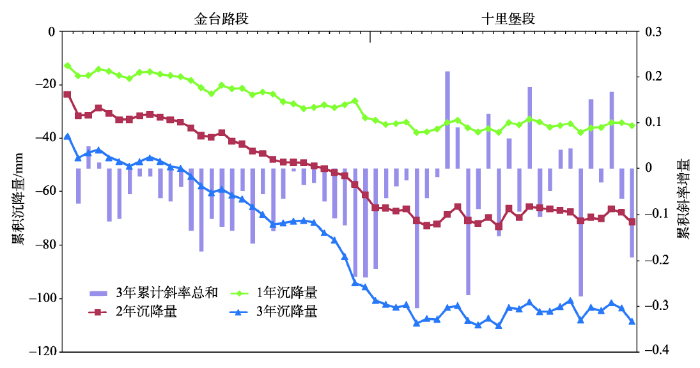 图5 金台路-十里堡路段2013-2015年累计沉降、斜率增量统计图