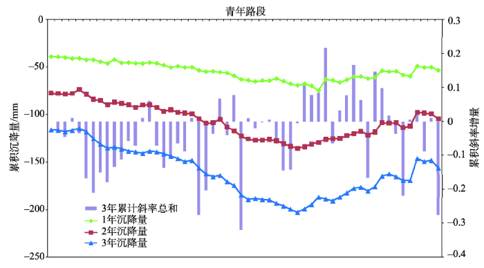 图7 青年路-褡裢坡路段2013-2015年累计沉降、斜率统计图