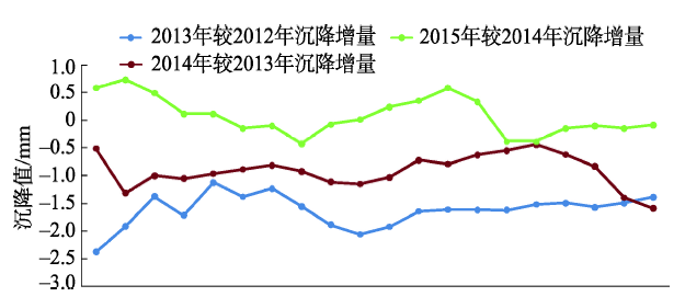 Fig. 8 Subsidence differences analysis of QingNian Road settlement from 2013 to 2015