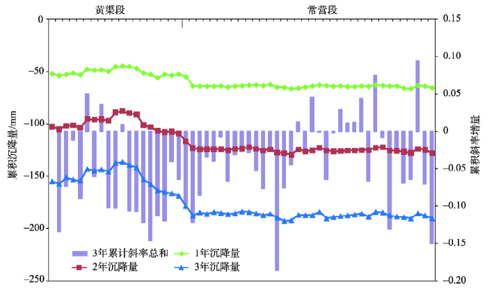 图9 黄渠-草房路段2013-2015年累计沉降、斜率统计图