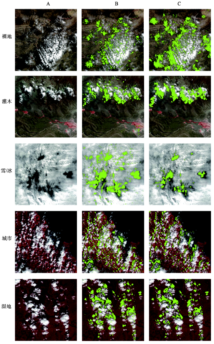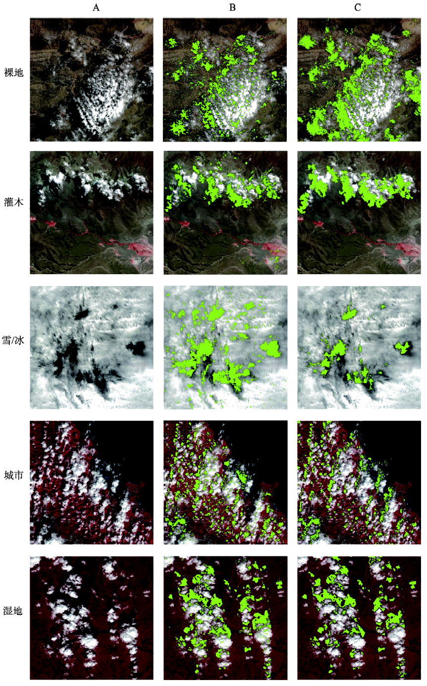 准确地识别云和云影一直是遥感应用研究中的难点。云有不同的类型,每种类型对应不同的光谱特征,而薄云信息会和下垫面信息混合[11],更增加了检测的难度。地表许多暗地物比如山体阴影、水体、湿地等和云影有相似的光谱特征,造成云影识别困难。目前,国内外学者基于Landsat数据构建云及云影检测方法已有很多,概括起来主要分为2类:单时相检测方法和多时相检测方法。单时相云、云影检测主要利用单幅影像光谱特征、纹理特征等,通过分析云和云影在影像上的分布特点和反射值,利用波段组合和统计手段扩大云和云影与清晰像元反射值之间的差异,设置阈值对像元进行云标记[12,13,14],单时相检测方法通常较为复杂,在寻找单幅影像云和云影光谱特征上,需要消耗大量的时间和精力,云和云影分布复杂多变,单一阈值无法解决地表覆被类型敏感性的问题。多时相云及云影检测主要利用多时相遥感影像间的线性关系,解决光谱间的差异[15,16,17,18,19]。李炳燮等[20]提出通过分析云及云影的光谱特征,进行对应波段之间的线性回归分析,进行匹配处理,从而识别云和云影。多时相云、云影检测要求影像数据之间严格配准,在进行云、云影识别前,需要进行高精度的大气校正和地形校正,且需要无云影像和有云覆盖的影像获取时间相近,Landsat在同一地区获取数据的时间频率为16 d,获取无云影像需要更长的时间间隔,期间土地覆盖变化等因素,会对检测结果造成影响。云影检测和云检测息息相关,通常先进行云检测,然后利用太阳、传感器以及云之间的位置关系得到云影的位 置[21,22,23]。单时相和多时相云、云影检测方法都需要先检测出云,然后检测云影,云影的检测精度取决于云检测的精度,通过单幅影像简单的光谱、空间形态特征,或是多时相影像光谱特征的差异来识别云及云影,无法保证云影检测结果的稳定性和有效性,且检测方法通常较为复杂。良好的云影检测结果,依赖于稳定有效的云检测结果,在土地覆盖变化检测等应用中,需要更便捷有效的检测方法。