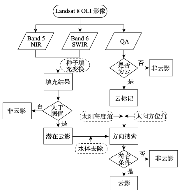 由于云的阻挡,地物在太阳光照射时反射值发生改变,云影在影像上体现为比周围环境更暗,云影的亮度来源于散射光,大气散射效果在短波部分较强,比如可见光波段,在长波波段相对较弱,如近红外和短波红外波段。此外,近红外和短波红外波段反射值通常较大,阴影的暗效应在近红外波段和短波红外波段表现更明显。因此,利用近红外和短波红外波段,可以快速找到潜在的云影[24]。本文先利用Landsat 8数据QA波段对云进行标识,再利用近红外和短波红外波段进行种子填充变换,通过设置阈值,得到云影识别的初步结果,采用ISODATA分类,得到水体掩模,将水体从潜在云影中去除,减少水体对云影识别的影响。结合太阳角度、可能的云高度等因素,对云和云影的空间关系进行匹配,确定云影的位置,检测出真实的云影像元。图1为本文进行云影检测的技术路线。