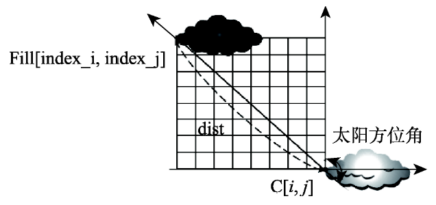 提取QA波段中标记为云的像元,记为C[i, j],i、j分别为其行、列号。近红外和短波红外波段种子填充变换后,阴影、水体等暗像元与周围环境分开,为了不漏掉云影,分析种子填充后得到的初步云影掩膜,选取合适的阈值,尽可能多的覆盖云影所在区域,本文选取种子填充变换后初步云影掩膜的像元平均值作为阈值,将大于阈值的像元标记为云影,记为Fill[ index_i , index_j ]。假设C[i, j]和Fill[ index_i, index_j]之间的水平距离为dist,如图3所示。如果C[i, j]为云(Cloud),填充后的像元Fill [index_i, index_j]为云影(shadow),并且水平距离和方向满足云和云影匹配条件,那么,Fill[ index_i, index_j]即为真实的云影,否则为伪云影。