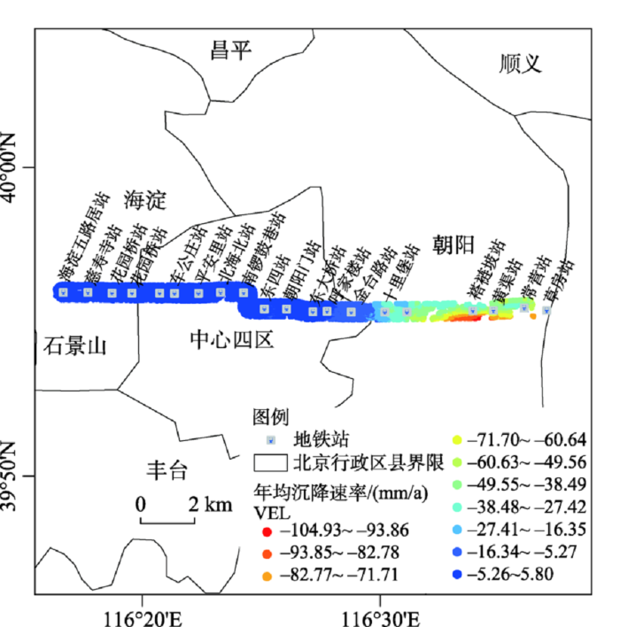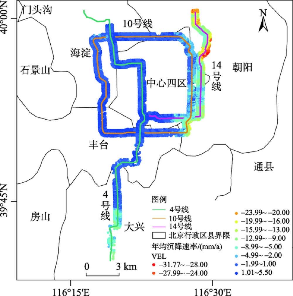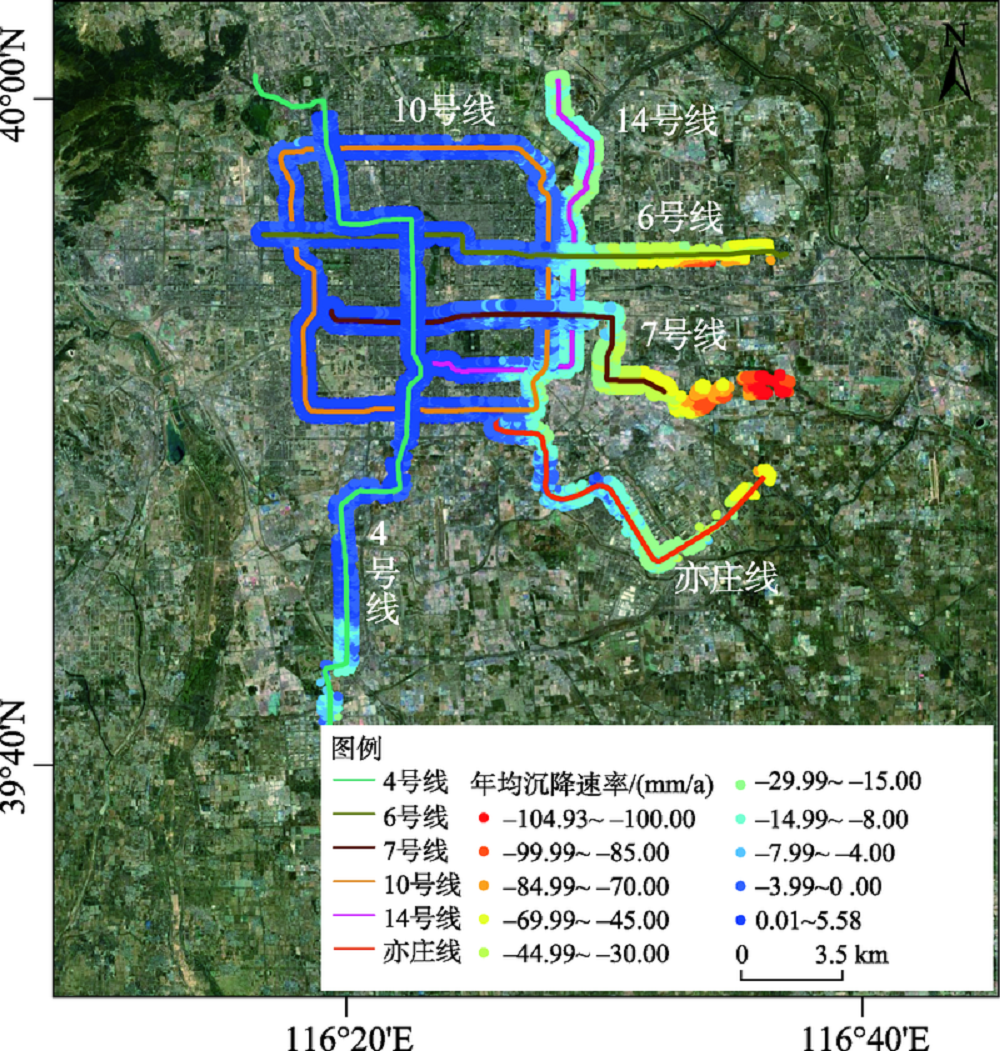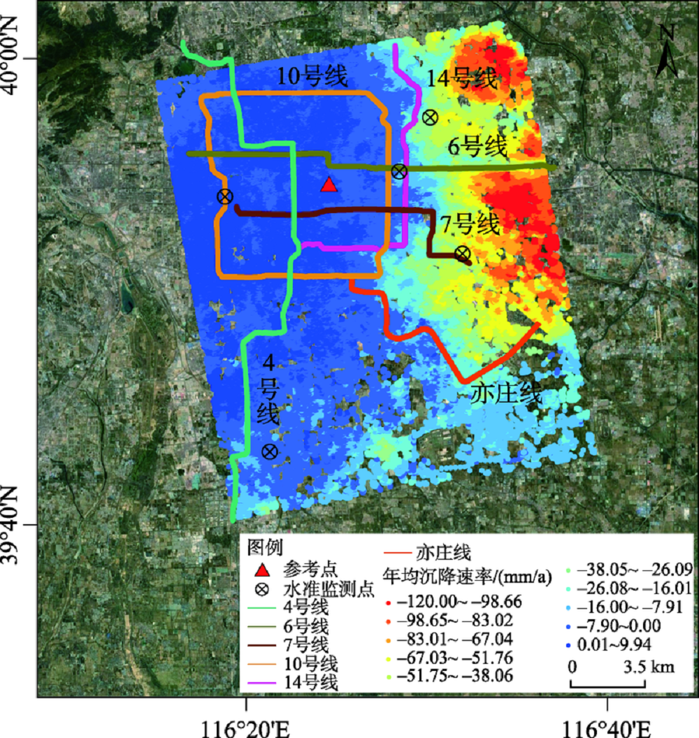 目前,国内外学者运用时序InSAR技术对地面缓慢形变的监测取得了较好的研究结果,然而现有对北京市地铁网络沿线形变的研究相对较少,多为仅针对单一地铁线沿线形变的研究;使用的SAR数据多为低分辨率影像,高分辨率影像使用较少;对地铁建设和运营全周期的地面沉降情况关注较少,多为将地铁施工建设作为引起城市地表沉降的一种因素进行分析。针对北京市大规模的地铁建设现状,本文采用时序InSAR技术,对地铁建设及建成运营全周期引发的地面沉降效应进行监测。同时,引入经验公式与InSAR监测结果结合,获取地铁沿线沉降槽的最大沉降值和沉降槽宽度等参数,揭示地铁隧道沉降槽的空间分布特征,丰富对地铁沿线地面沉降发生、发展规律的认识。