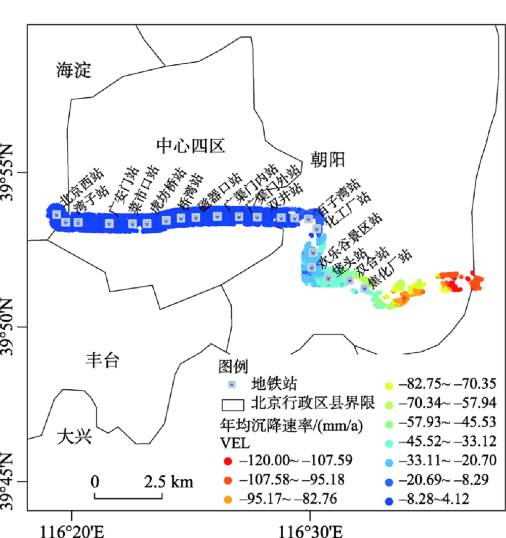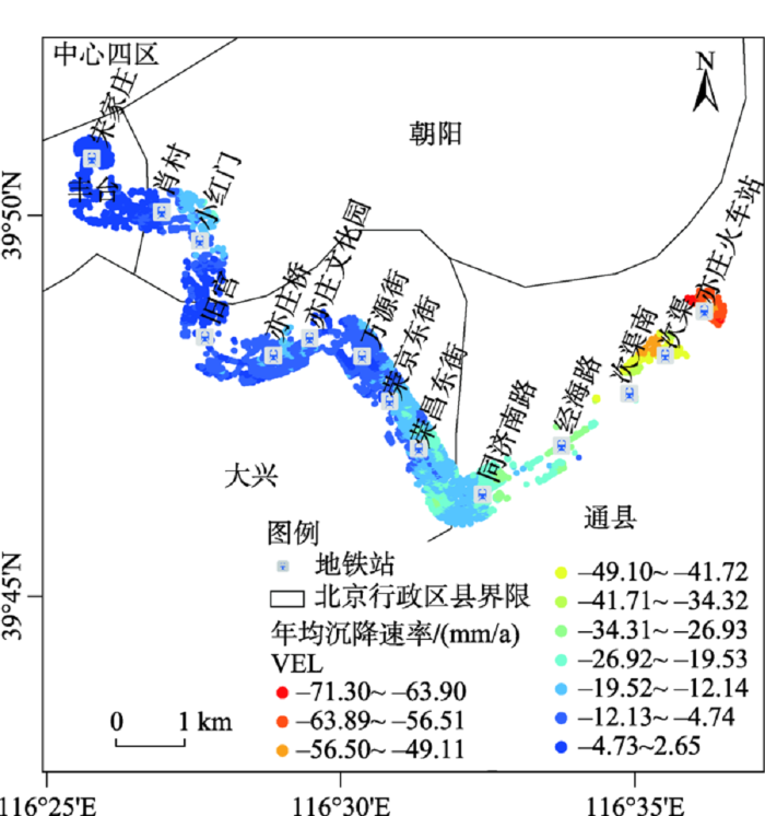 图5 北京市地铁沿线1 km范围内沉降速率图