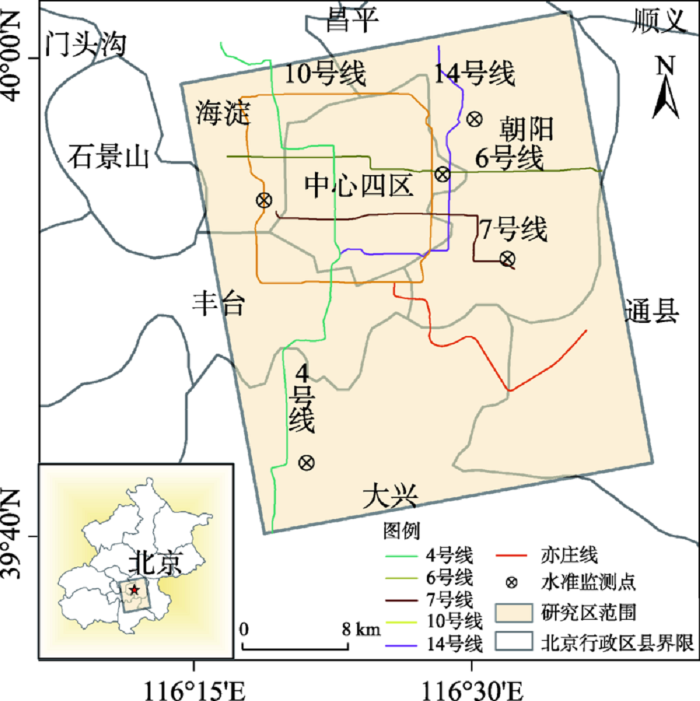 Fig. 1 Distribution map of study area,metro line and level monitoring poin
