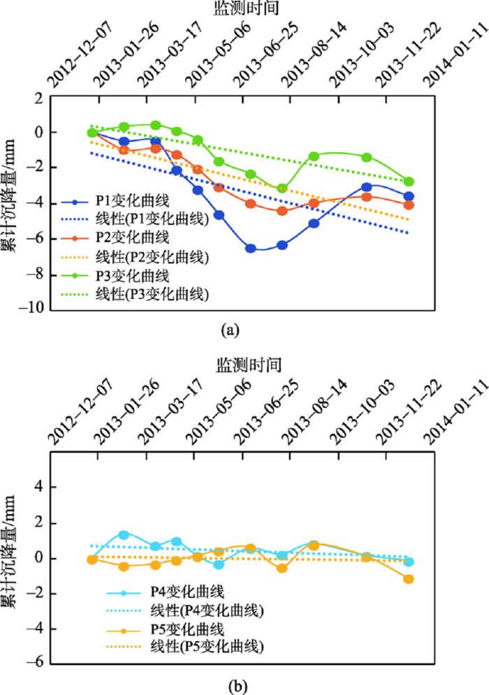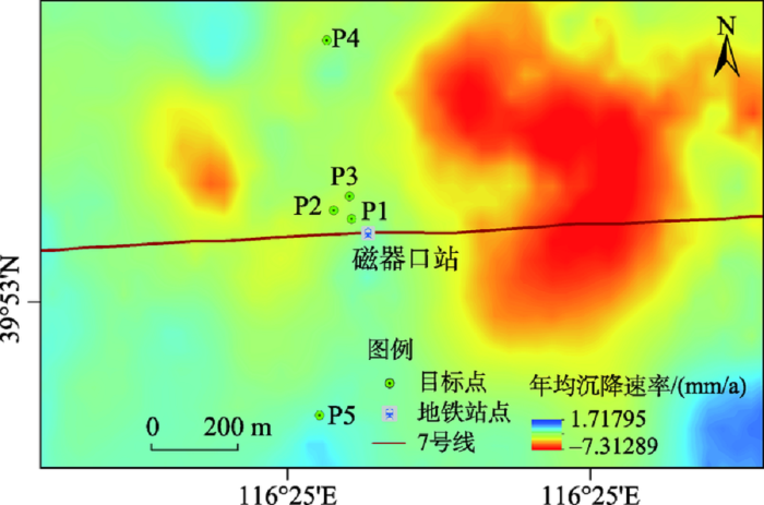 如图12所示,图中目标点P1、P2、P3的时间变化沉降特征具有相似性。2013年1月-2013年3月底沉降缓慢,2013年4月开始至9月这一阶段沉降速率增大,2013年9月之后沉降减缓,上述沉降时间分布特征正好与地铁7号线磁器口站施工建设的时间节点相吻合,地铁站在施工建设过程中体现出了沉降加速。而距离地铁站较远的目标点P4、P5,沉降都基本保持稳定,没有出现沉降明显加速的特征。由此可见,地铁施工建设会对地面沉降产生一定的影响。