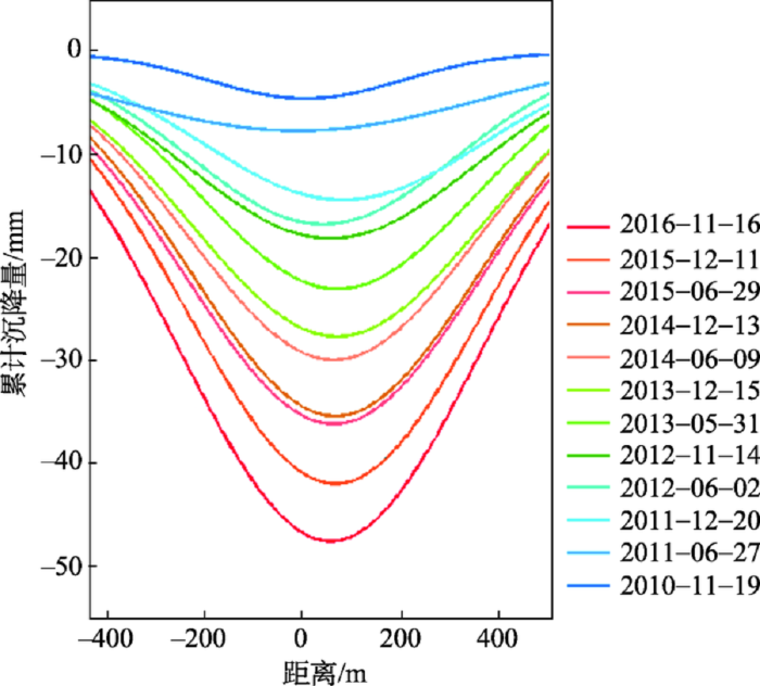 为进一步分析沉降槽长时间序列下的空间形变特征,将目标点按时间序列分别进行拟合,由图16可看出参数Smax和i呈现增加趋势,表明2010-2016年沉降呈现扩大趋势,参数Smax值介于-42~ -4 mm之间,沉降槽宽度i由42 m增至约180 m。