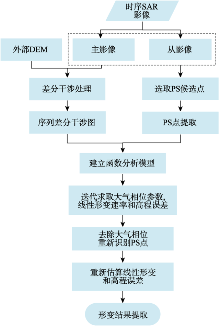 将配准后的SAR影像基于一定的准则和阈值来选取PS候选点以及确定PS点。在提取PS点后,获取PS点的差分干涉相位,基于这些目标点来计算DEM误差、视线向形变量以及大气效应贡献值,估计并去除大气相位值,剔除差分干涉相位中的残余地形相位,最终获取地表形变信息。技术流程图如图2所示。