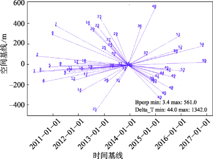 综合考虑时、空基线距及多普勒质心频率差的影响,在获取的2010年4月至2016年12月共55景TerraSAR-X影像中,选择2013年12月15日的影像作为主图像,生成54对差分干涉对,其时空基线分布如图3所示。依据振幅离差阈值法和相干系数阈值法,从配准后的SAR影像中来选取PS候选点。将振幅离差阈值设为0.25,相干系数设为0.7,得到704 094个PS点,且绝大多数点的相干性大于0.8。在提取PS点相位信息后,基于迭代的方法进一步估算每个PS点的DEM误差、形变速率以及大气相位,最终得到PS点的地表形变信息。