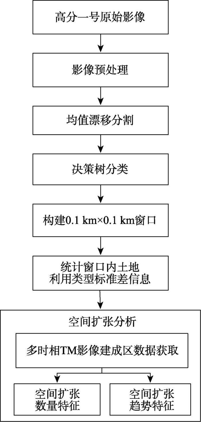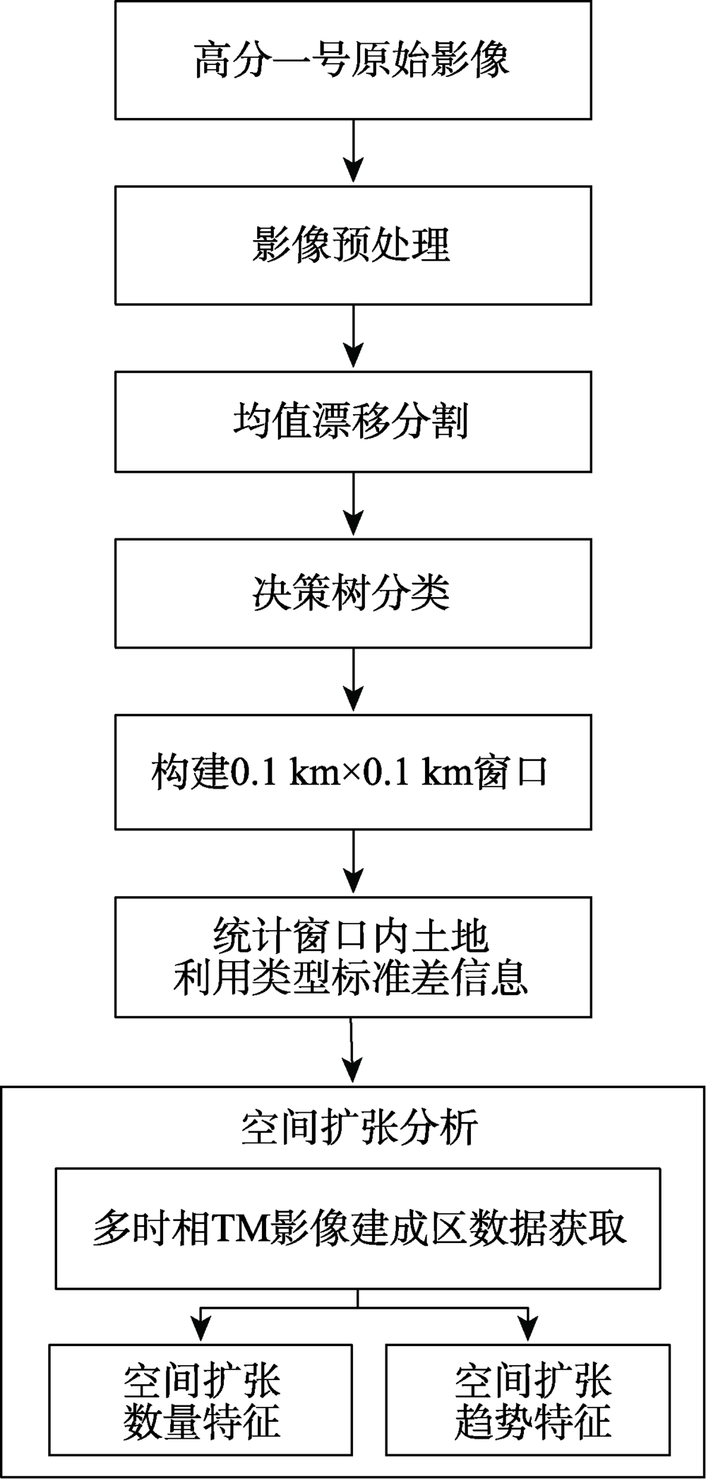 建成区区域内部建筑物均匀排列分布、道路纵横交错穿插其中,其中道路和建筑物有着明显的几何轮廓,与其周边的其他地物色彩区别度大。基于面向对象的分类方法,很好地避免由基于像元分类产生的“椒盐”现象,在进一步以土地利用类型为统计变量提取建成区边界时更稳定。结合上述分析,本文建立了基于高分遥感影像实现建成区边界提取与城市扩张分析的方法:① 实现对高分一号影像(融合后2 m空间分辨率)分割与分类,获得土地利用分类结果;② 构建土地类型标准差统计变量提取建成区边界;③ 基于高分建成区范围得到有效样本,获取多个年份建成区数据;④ 从建成区的数量特征、趋势特征分析研究区空间扩张过程。