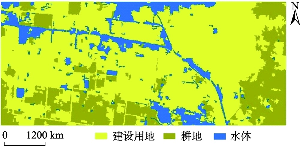 基于遥感影像,利用GIS软件人工选取地物分类样本。根据人工勾绘的样本以及影像分割结果,基于地理位置属性,匹配样本标签,采用决策树进行分类。将影像中的土地类型分为耕地、水体和建设用地3大类,如图3所示。