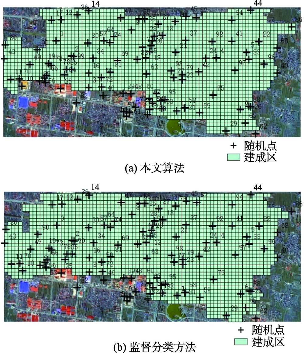 对提取的结果基于随机点进行验证。为了验证基于本文方法提取的建成区有效性,采用基于像素的一般监督分类方法(基于同一样本数据)获得分类结果;同样基于标准差统计变量提取建成区边界。采用的数据同样为2017年2月27日高分一号影像。实验中,经过多次验证,在0.1 km×0.1 km窗口内标准差统计变量的阈值设定为0.25-0.35获得如图4(b)建成区边界。