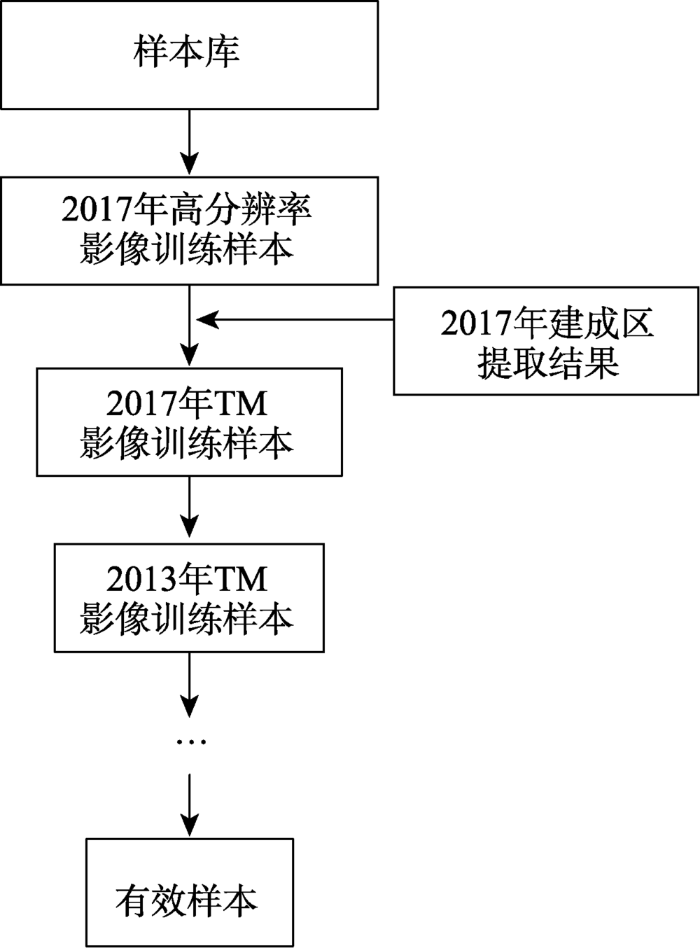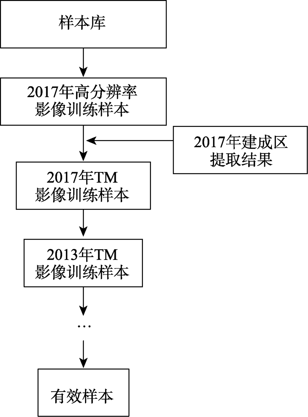 首先参照前期获取的样本库(基于高分一号卫星建立的包括建筑物、耕地、林地、裸地和水体等多种地物类型样本集合),在2017年高分一号融合影像上建立样本训练区,获得800个样本,参照2017年建成区提取结果,将样本辐射到2017年TM影像上,通过样本有效性检验,保留了其中的600个训练样本。然后以此为参考,对照2017年TM影像逐步辐射2013、2009、2000年影像,最终获取约300个有效样本。此方法获取的是时间序列内公共的样本区,建立了辐射归一样本,从而保证了不同年份建成区数据的可比性。流程示意图如图5所示。