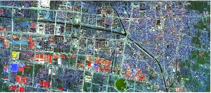 试验使用的数据是2017年2月27日获取的高分一号PMS 8 m多光谱和2 m全色影像。利用 ENVI软件对获取的数据进行了预处理,包括对多光谱和全色影像进行辐射纠正和几何纠正与配准(包括多源数据间的相互配准),然后对其进行了融合处理,得到该区域的空间分辨率为2 m的融合影像。对于其他年份的数据本文使用30 m分辨率的TM多光谱数据。由于虞城县的发展主要集中在中心城区(包含城市大量建筑物、道路等信息),因此实验中主要选择虞城县城区为研究区域(影像尺寸大小为4537像元×2759像元)。虞城县中心城区研究区域如图2所示。