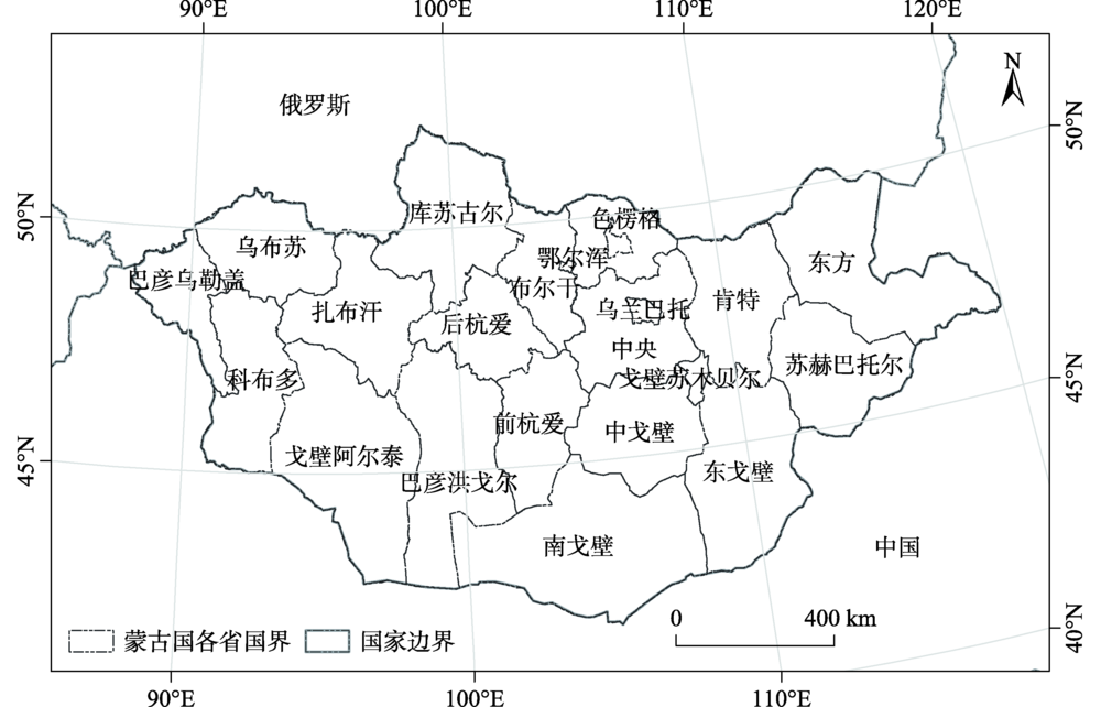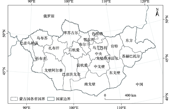 蒙古国位于北纬42~52°、东经88~120°之间,其东、南、西三面与中国接壤,北面与俄罗斯毗邻,国土面积156.65万km2[16],是世界第二大内陆国家。蒙古国地势高峻,平均海拔1580 m,整体呈现西高东低的地势走向,植被多覆盖在西北部高山区,东南部则以戈壁平原为主[17,18]。蒙古国大部分地区属大陆性草原气候区,冬季严寒、夏季炎热,平均降水量冬季为10~15 mm,夏季为200~250 mm。蒙古国地广人稀,截止2017年3月蒙古国人口311.9万,人口密度不足2人/km2。蒙古国经济以畜牧业和采矿业为主,是亚洲重要的矿产资源输出国,畜牧业和矿业贸易占其GDP的85%左右。研究区范围如图1所示。