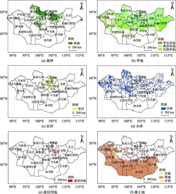 (5)建筑用地。建设用地作为典型的人工地物类型,其变迁深受人类活动影响。蒙古国的建设 用地以中心城镇建设用地为主,此外还包括少量的工矿、蒙古包等占用地。蒙古国的建设用地空间 分布比较分散,几乎每个省份都有少量分布。结合图6(e)可看出,研究区的建设用地分布区域鲜明,乌兰巴托市、中央省等中心城市建设用地面积较大,其他各地都非常少。