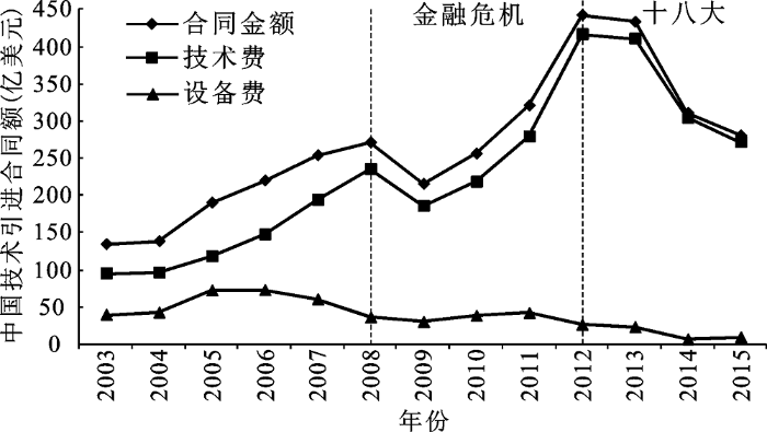图1 2003~2015年中国技术引进合同额时间变化未包含港澳台数据