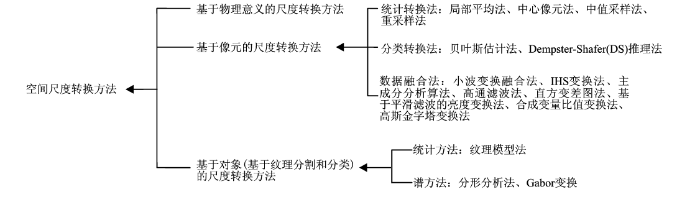 本文根据国内外已有的研究成果,系统的梳理了当前主要的空间尺度转换方法(图1),并重点阐述其中常用的统计转换法、分类转换法、数据融合转换方法、分形分析法、基于局域动态模型的转换方法和基于物理意义尺度转换方法。
