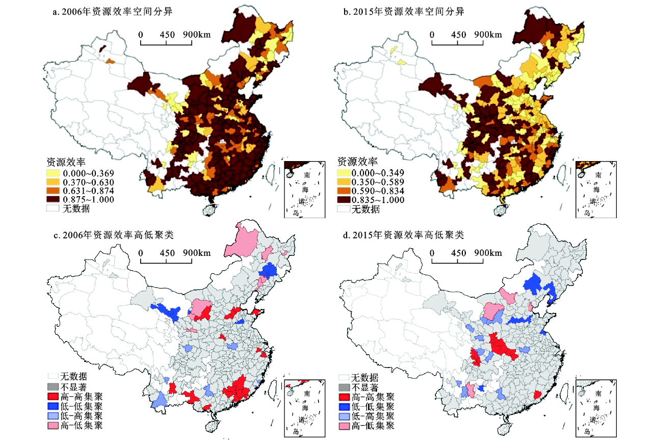 由图1a、1b可以看出,2006年中国工业资源效率普遍位于高等级区间,高等级工业资源效率城市空间分布较为均衡,广泛分布于东部沿海铁路通道,中部京广线、京九线以及西部包兰线、宝成线、成昆线等铁路沿线,如北京、广州、武汉、成都、宝鸡等城市,2015年逐渐向中部京广线、京九线长江以南沿线城市和西部沿包兰线、宝成线、陇海-兰新线的中卫、武威、宝鸡、绵阳等城市转移。可以看出,工业资源效率的空间分异特征逐渐由东部高于中西部,东中西大致均衡,向西部高于中东部,区域不均衡转化。2006~2015年工业资源效率空间变异系数由0.32上升至0.51,表明从全国层面来看城市之间工业资源效率差距不断拉大。