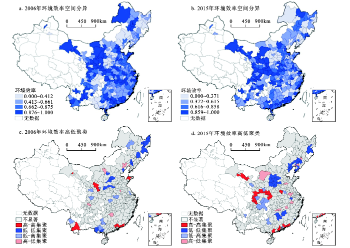 2006年和2015年的Moran’s I指数分别为0.108 6和0.126 7,均通过0.001水平的显著性检验(表4),表明工业环境效率呈现明显的空间正相关,且空间相关性明显提升。由图2c、2d可以看出,2006年低-低集聚区主要分布在东北以及山西等地,2015年主要分布在辽宁、山西以及湖南的部分城市。这些地区以石油化工、能源电力、机械制造等为主的高耗能高污染产业比重高,规模大,加之产能落后,绿色发展能力低,不利于环境效率的提高。高-高集聚区明显增多,2006年主要分布在陕西、广东和云南的部分城市,2015年主要分布在广东、陕西、四川和甘肃的部分城市。广东和四川主要以仪器仪表、通信电子以及生物医药、新材料等先进制造业发展为主导,陕西在近年的发展中,汽车、航空、电子信息、新材料、生物医药等新兴非能源产业增长迅速,推动了这些地区环境效率的提升。甘肃工业规模小,近年来注重传统产业的改造升级和落后产能淘汰,绿色发展能力得到有效提升,推动了环境效率的提高。