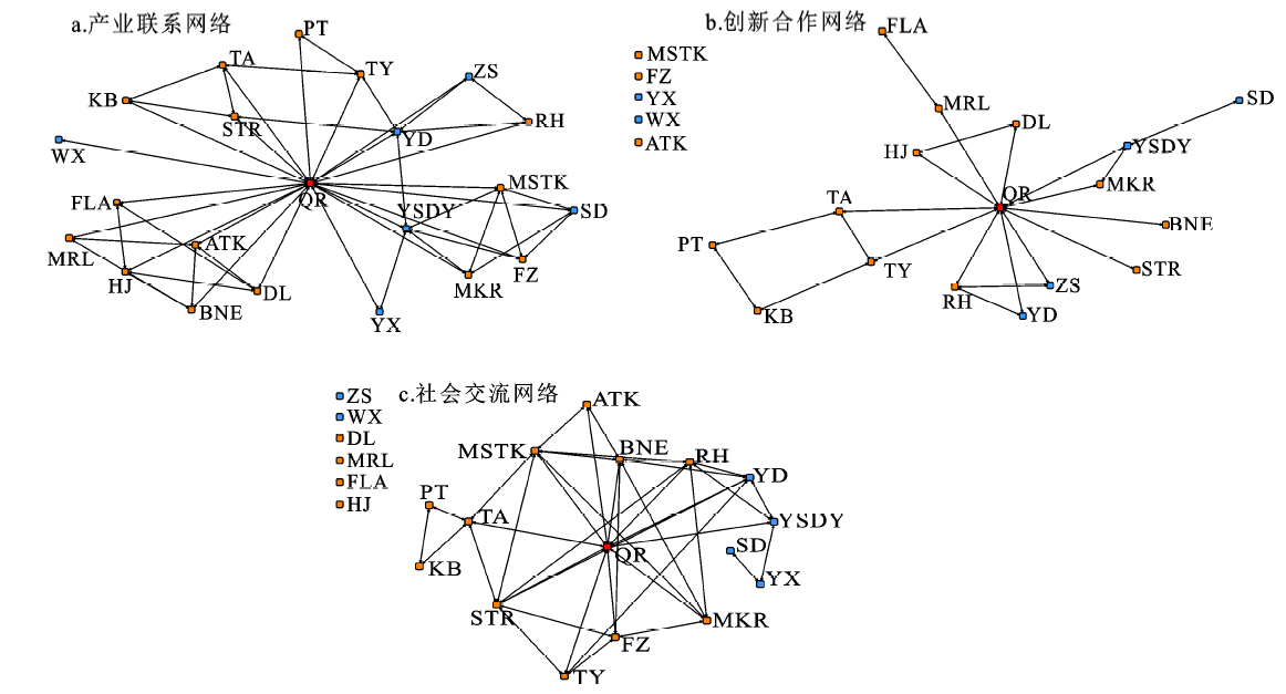 | 图2 技术引进阶段(1997~2005年)的产业集群网络结构 注:蓝色表示国内转企业,橙色表示境外转移企业,红色表示本土核心企业;QR为奇瑞总公司,下同;网络外部企业孤立点,表示网络关系中与其他企业不存在联系,下同。 |
