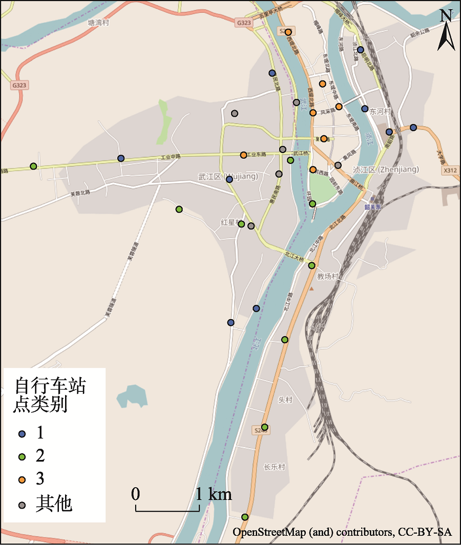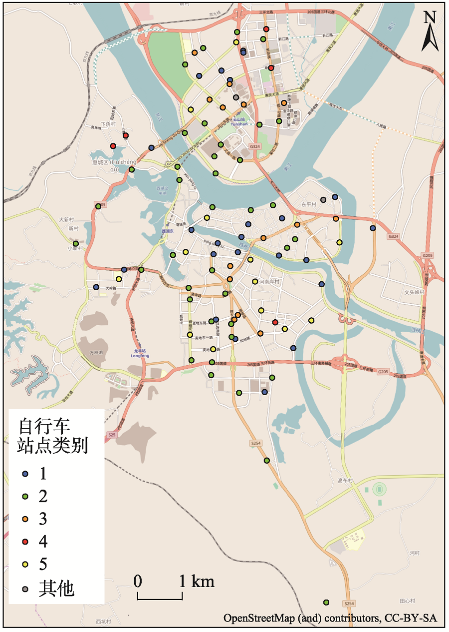 惠州市惠民自行车公共服务系统项目已作为惠州市2012年十大民生实事之一进行重点推广;另外,摩拜、ofo等无桩共享单车在研究数据时段内未进入市场,只在个别园区试运营。在韶关市,主要道路的自行车高峰小时交通流量不大,部分主要道路的自行车交通量在100辆/h以下[15]。市区建成范围有限,31个自行车站点覆盖了绝大部分交通要道。综上,惠民运营系统能够一定程度反映研究区公共自行车的整体情况。